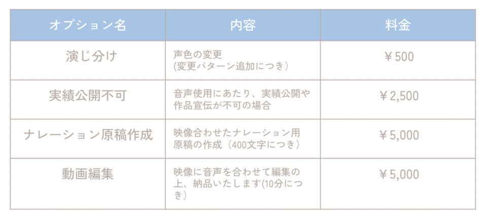 ナレーション収録サービスでは、制作過程で様々な作業が含まれておらず、気づくと予算を大きく超えてしまうことが多々あります。当サービスでは、ご予算内の安心価格でご提供できるよう、完成までに必要なオプションをはじめからできる限り含んだお得な基本料金となっております。