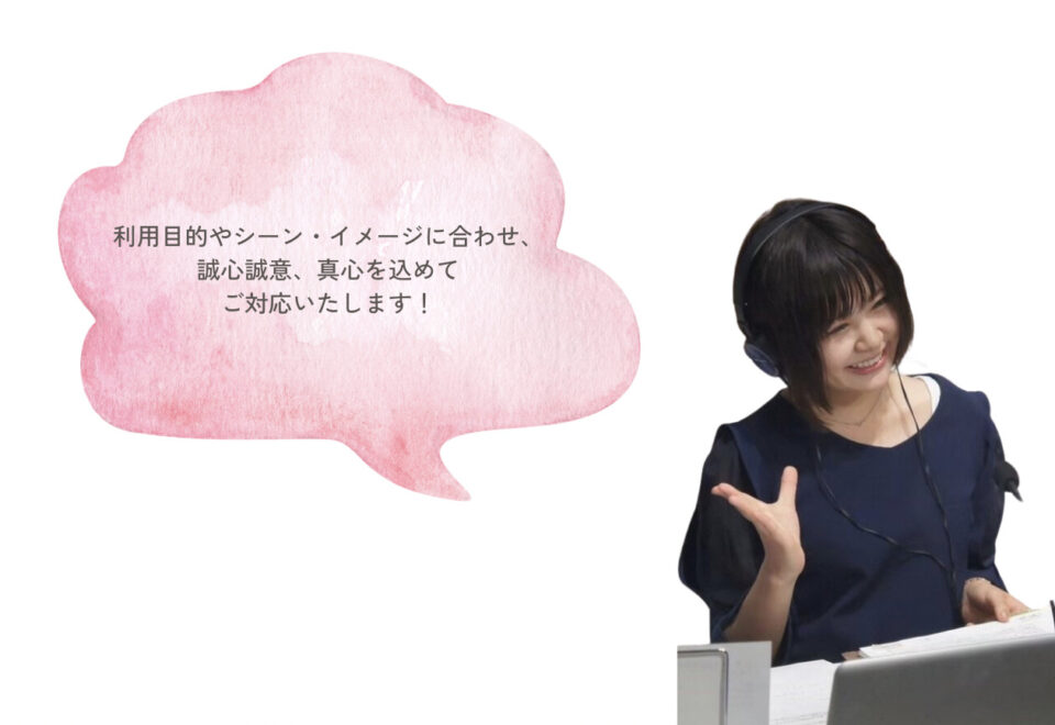 お客様のご要望を丁寧に汲み取り、念入りに擦り合わせの上、最終納品まで真心をこめて対応いたします。「思っていたイメージと違う… 」というようなことがないよう、ボイスサンプルをご納得いただけるまで作成の上、スピーディーかつ丁寧なサービス提供をいたします。