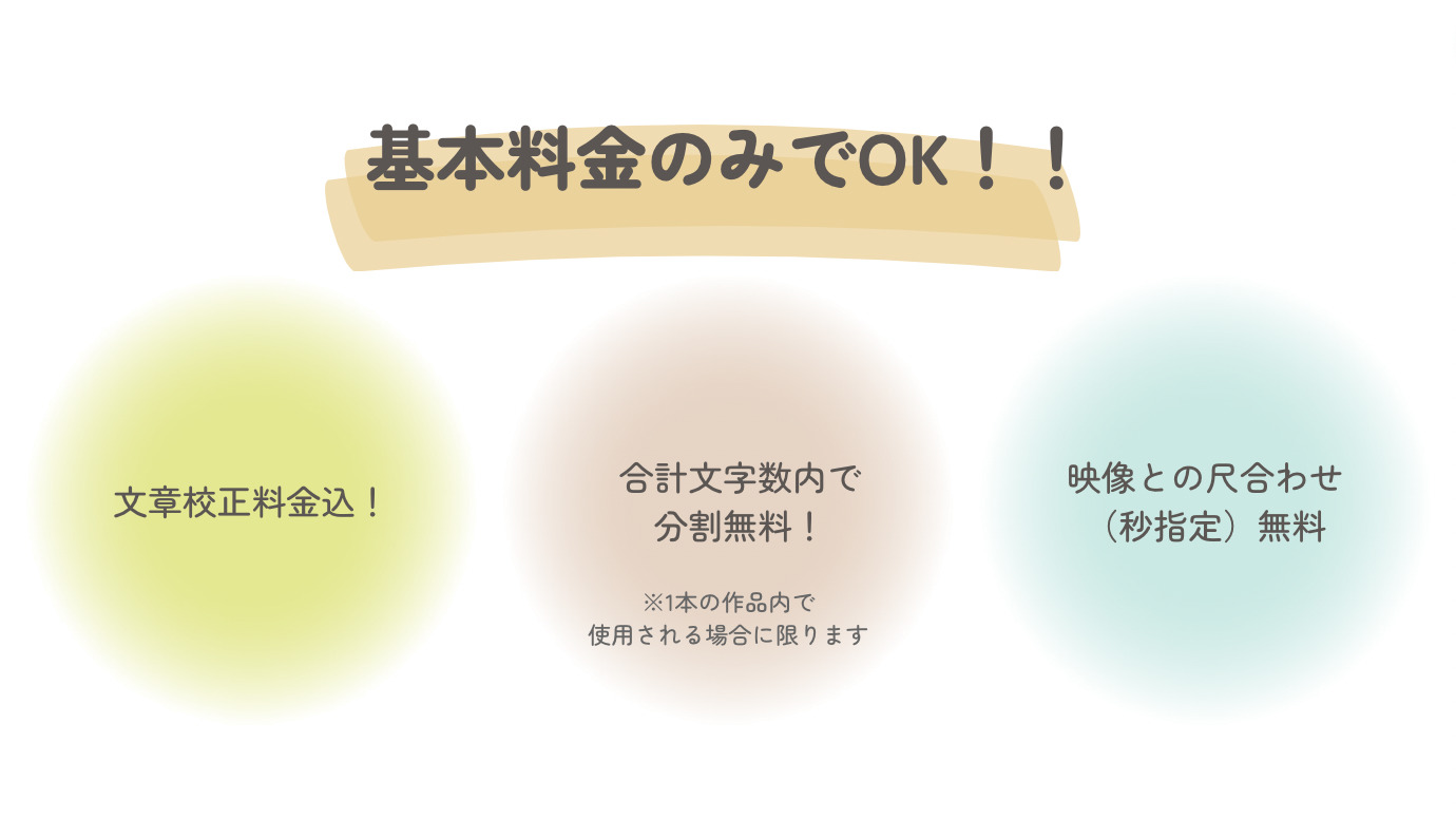 一本の作品内で分割納品を希望の方にも嬉しい、安心の低価格でご提供いたします。Youtubeでのナレーション等の対応に大変ご好評をいただいています。